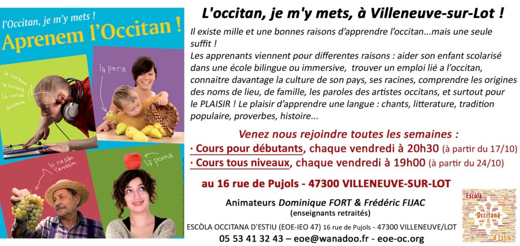 Corses per adultes a Agen (47) a l’annada : existís mila e una bonas rasons d’aprene l’occitan… mas una sola basta ! Los aprenents venon per rasons diferentas : ajudar son mainatge escolarizat dins una escòla bilingua o immersiva, trobar un emplec ligat a l’occitan, connéisser mai la cultura de son païs, sas rasigas, comprene las originas dels noms de luòc, de familha, las paraulas dels artistes occitans e mai que mai lo PLASER ! Lo plaser d’aprene una lenga : cants, literatura, tradicion populara, provèrbis, istòria…